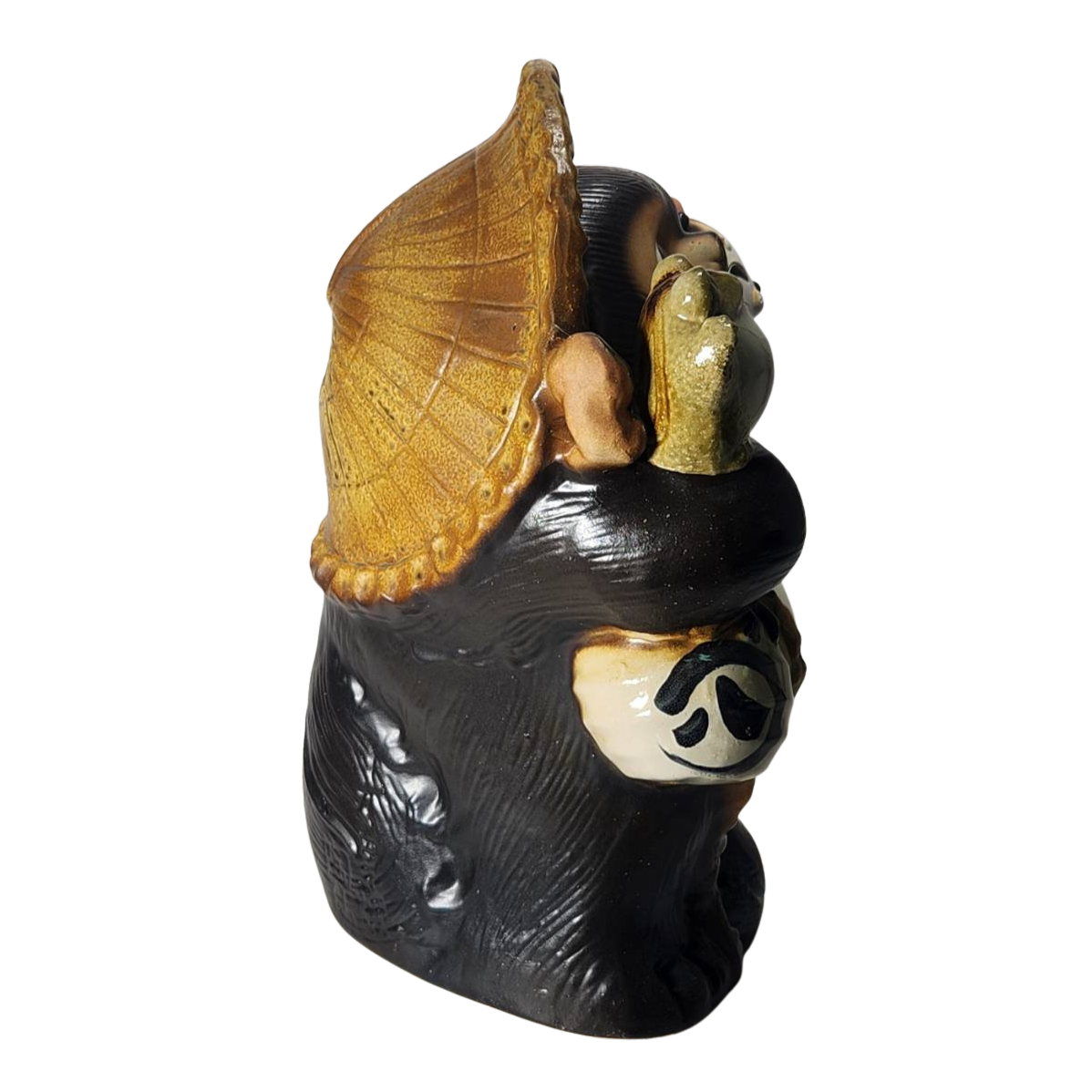 招き猫のポーズと蛙の付き具合が絶妙でしっかりとしたつくりのこの狸は、和の雰囲気を演出し、見る人に温かみを感じさせます。陶器特有の質感と優しい色合いが、空間にリラックスした雰囲気を与え、心豊かな時間を過ごす手助けをしてくれます。